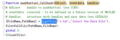 This button uses the uigetfile() function in MATLAB to open a file dialog, allowing users to select a text file containing the data. The input data is stored as a global variable. The main code is shown below: